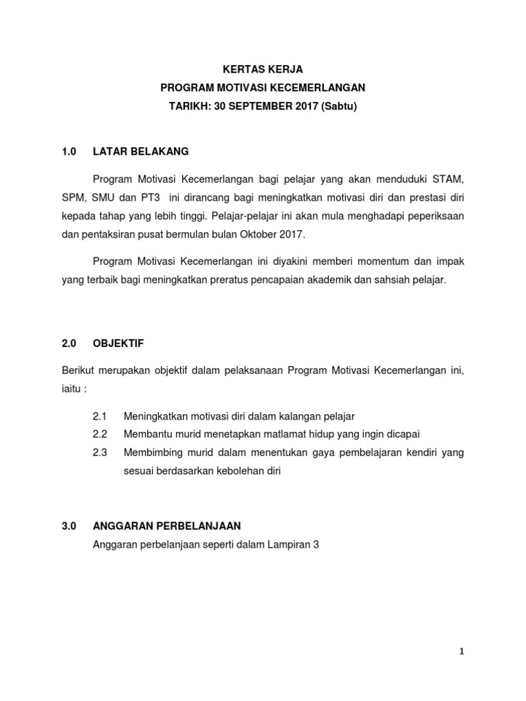 Kertas kerja ini membahas sejumlah faktor penentu kinerja murid berdasarkan tes. Kertas kerja kem motivasi 2012. Kertas Cadangan Program Motivasi dan Seminar Teknik Menjawab Soalan PMR dan SPM SMK Sukau Kinabatangan 2009 I.